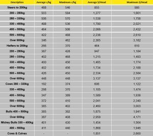 Weaner steers under 200kg topped at 546c/kg and averaged 488c/kg, weaner steers in the 200-280kg range reached 594c/kg and averaged 503c/kg. Steers in the 280-330kg range reached 570c/kg and averaged 506c/kg, and steers in the 330-400kg range reached 536c/kg and averaged 498c/kg. Feeder steers in the 400-500kg range topped at 506c/kg and averaged 464c/kg.