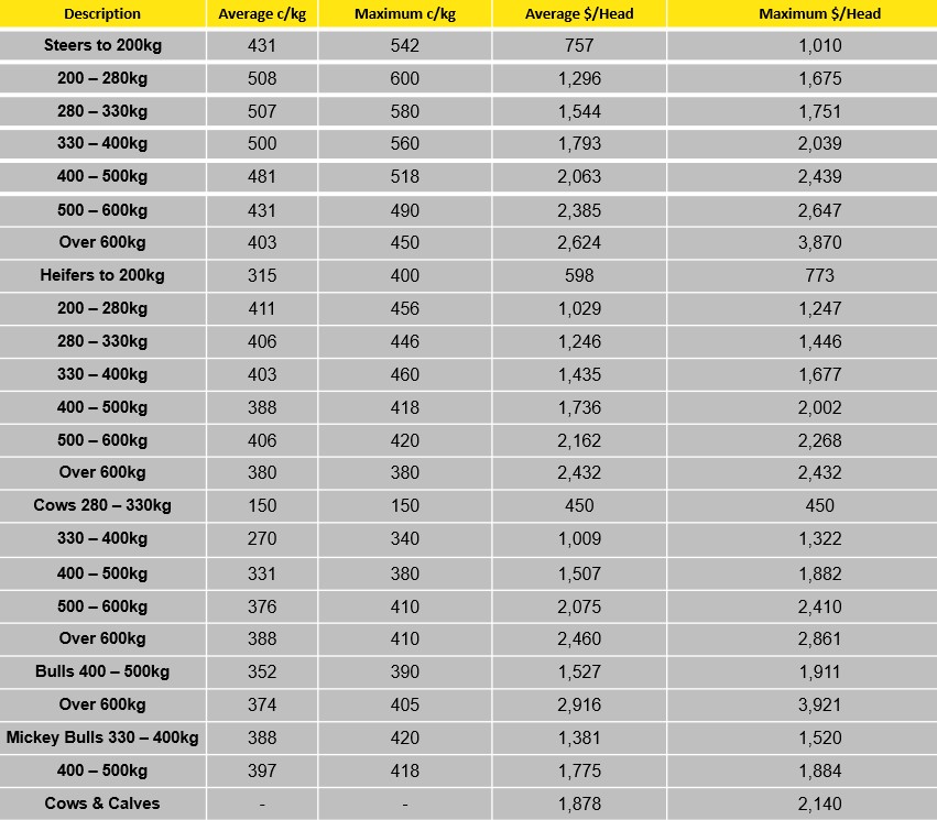 Weaner steers under 200kg topped at 542c/kg and averaged 431c/kg, weaner steers in the 200-280kg range reached 600c/kg and averaged 508c/kg. Steers in the 280-330kg range reached 580c/kg and averaged 507c/kg, and steers in the 330-400kg range reached 560c/kg and averaged 500c/kg. Feeder steers in the 400-500kg range topped at 518c/kg and averaged 481c/kg.